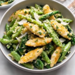 Garlic Cream Bucatini with Peas and Asparagus is a delightful fusion of creamy richness and vibrant vegetables. The bucatini pasta, with its unique hollow shape, perfectly captures the luscious garlic cream sauce, while fresh green peas and asparagus add a satisfying crunch. This dish not only pleases the palate but also creates a stunning presentation that will impress your guests at any gathering. Simple yet elegant, it’s an unforgettable meal that invites seconds!